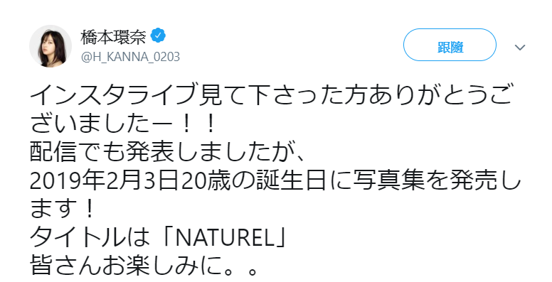如今寫真集也已經在推特上成立官方粉絲團,搶先在正式販賣前先公開部分照片供粉絲們先一賭風彩,日本有許多網友也留言表示「絕對要買!」、「可愛到爆炸了!」、「超級期待!」、「既然是20歲紀念,我就買20本好了」,也讓人一賭橋本環奈「千年一遇」美女的地位早已擄獲日本網友的心,到時寫真集販售想必會再度掀起網友熱購潮。