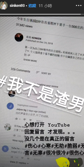 昨凌晨肯肯也在IG中用斗大的字眼打上:「我不是渣男」,表示打開YouTube回覆留言才發現四百多則留言中,很少人是真正因為影片而留言,反而都是特地留言罵他的人,讓他崩潰hasgtag了「傷心、心寒、無助、脆弱、無言、無辜、很冷很冷」等詞彙!