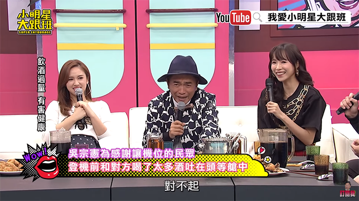 被灌醉的吳宗憲走路搖搖晃晃,好不容易上了飛機,椅子突然被往後一推,沒想到他瞬間吐了出來:「我就真的身為一道彩虹了。」吳宗憲哭喊著道歉,直說「飛機上都是有頭有臉的人,真是丟臉!」連女兒Sandy聽了都忍不住搖頭:「頭等艙欸!我的媽啊!」