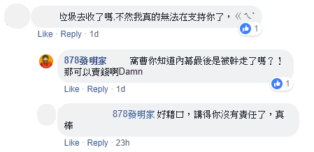 當時878對於這些留言皆未做回覆,直到近日878發明家再度推出新影片,網友在新的貼文下方打上:「垃圾去收了嗎,不然我真的無法在支持你了,ㄍㄟˋ」,878發明家才回應:「窩曹你知道內幕最後是被幹走了嗎?!那可以賣錢啊」!