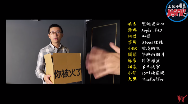 上班不要看近日上傳新影片,只見影片中呱吉一到公司,大家就對他大喊"You're fired",接著更用頭套將他套住,帶到他的位子上,然而他的頭套一摘下來後,便可以看見座位已經完全被清空,讓他傻眼直呼:「我還要在這裡做直播欸」。之後他則拿著團員幫他收好的箱子,在大家的歡送下走出去!
