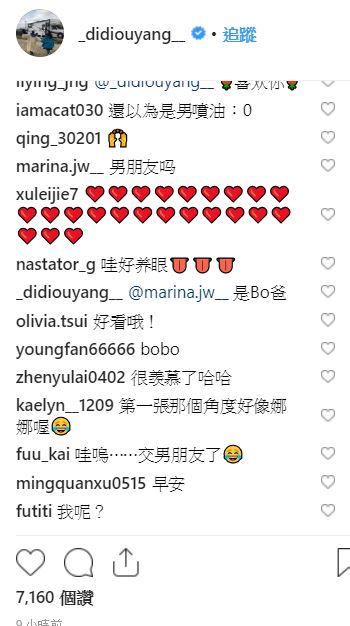 不過另一張照片中,歐陽娣娣竟半邊身體躺進Bo爸的胸口,而男方也順手抬手將他摟進懷中,因為互動實在太親密,引起網友猜測歐陽娣娣是在宣布戀情,並紛紛表示「還以為是男噴油」、「是男朋友嗎」、「挖嗚交男朋友了」也讓部分忠實粉絲心碎滿地。