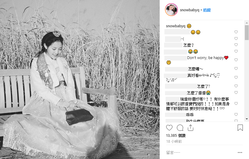 雖然瑞雪平時就是瓜子臉、尖下巴,這次的照片仍讓網友認為修圖太誇張。而她後來也放上一張黑白版本的韓服照,更打上了哭臉的表情,疑似受到酸民留言的影響,也讓許多粉絲留言替她加油打氣。