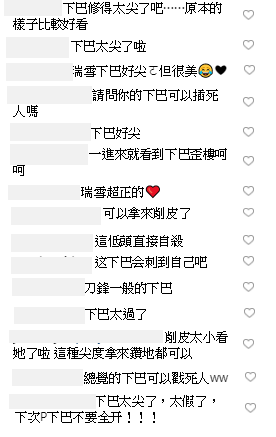 可以看到許多網友紛紛留言:「下巴修得太尖了吧」、「請問你的下巴可以插死人嗎」、「可以拿來削皮了」、「下巴怎麼了」、「下巴真的好尖」、「這低頭直接自殺」、「下巴也太尖了吧!」、「刀鋒一般的下巴」、「這種尖度拿來鑽地都可以」、「修到太不自然了」、「下巴太尖了,太假了」。