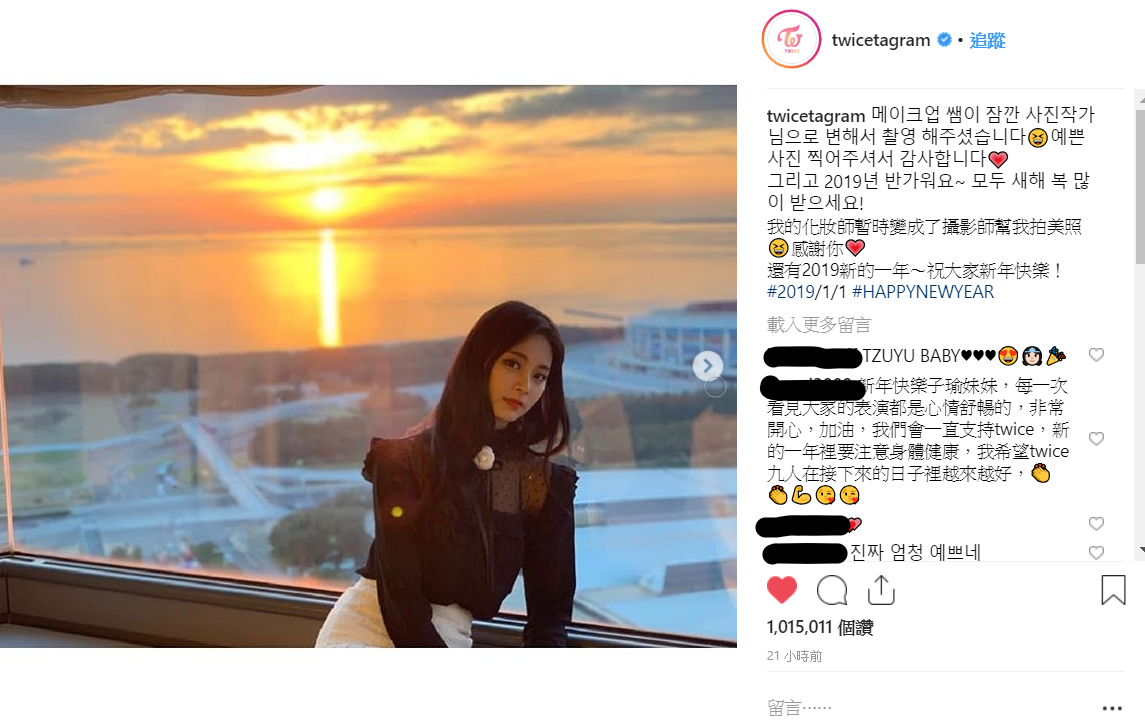 子瑜也在PO文中寫道:「化妝師暫時變成了攝影師幫我拍照,謝謝你,還有2019新的一年~祝大家新年快樂!」向粉絲們溫暖傳遞訊息,而她的神級美照至今也已吸引超過100萬粉絲按讚留言,粉絲也溫暖回應子瑜「新的一年也會繼續支持TWICE,祝福TWICE在2019年能有更好的表現」。
