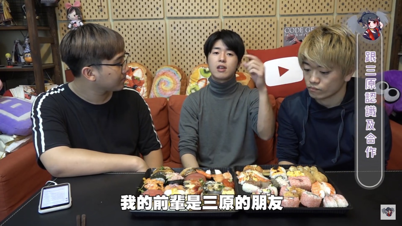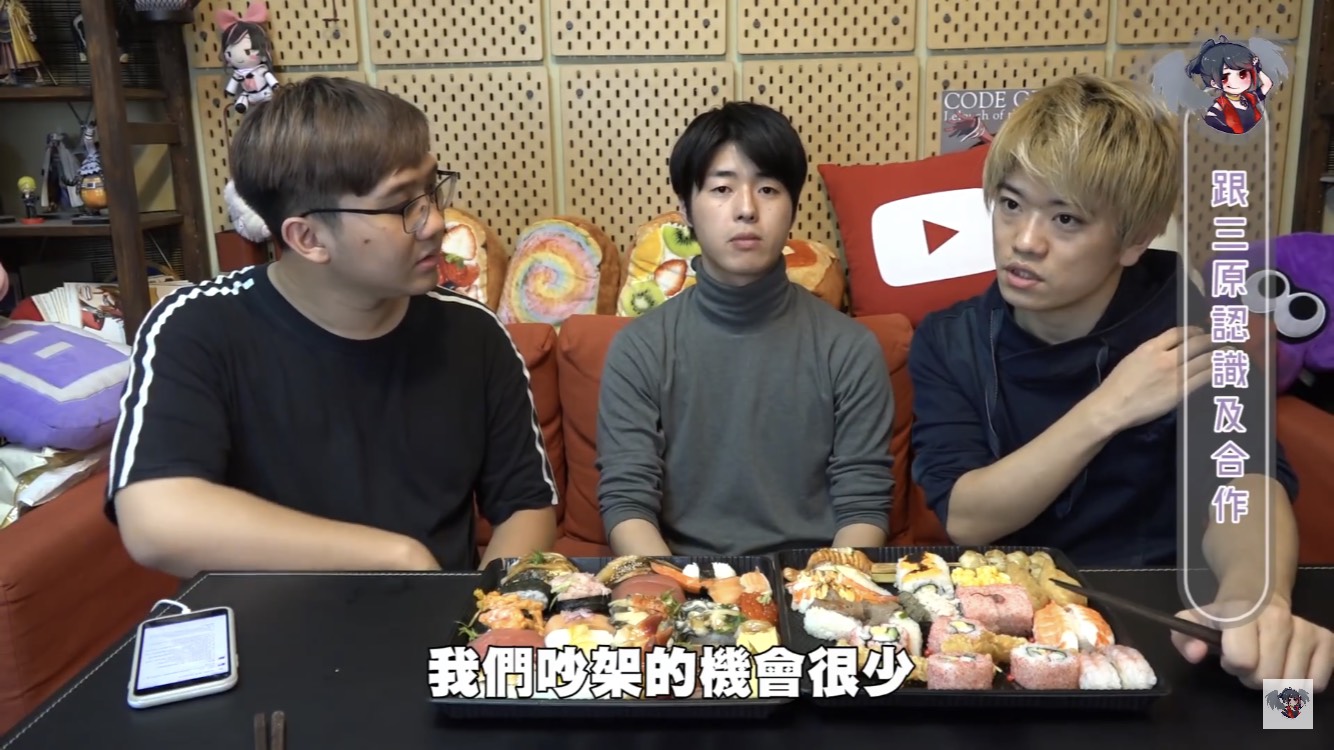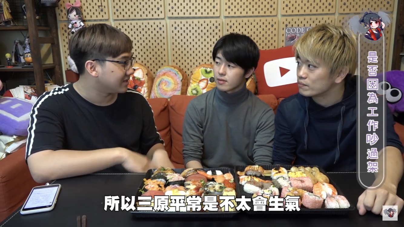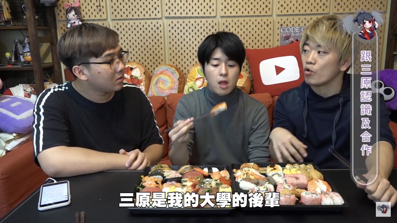 黑羽的這餐我請,這次請到三原團隊中的Jun醬、Tommy,除了邊享受壽司大餐,不免俗也得接受黑羽的問題,當黑羽問到團隊中有沒有因為工作吵過架時,兩人均表示,團隊從來沒有吵過架。至於為什麼會跟三原認識後來加入團隊,Jun醬表示他跟三原同是慶應大學學長、學弟的關係,因緣際會下,就加入了,Tommy則是因為當時受朋友邀請,跟三原合作拍攝兩千元企劃後,才確立自己想當youtuber的目標。