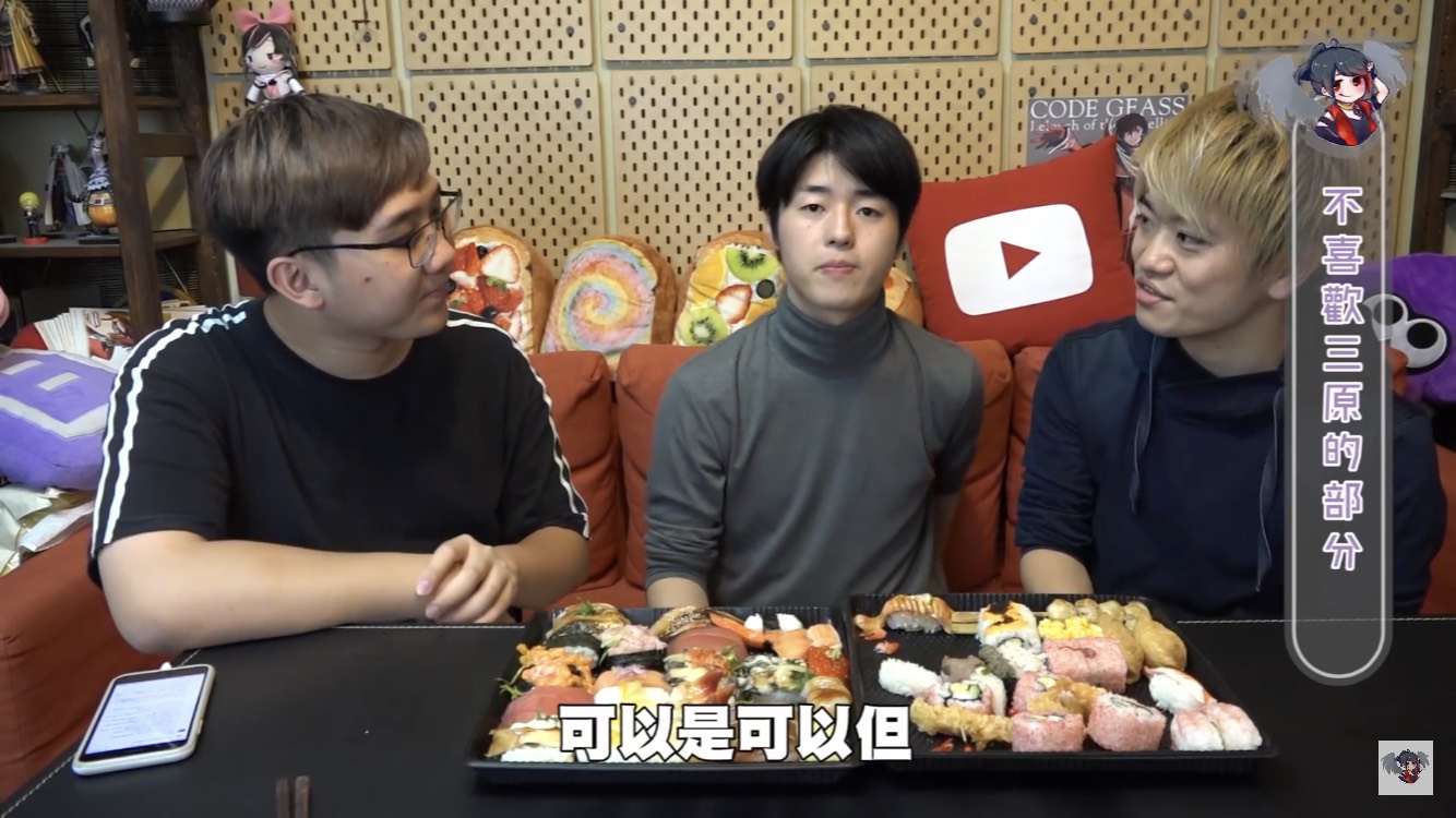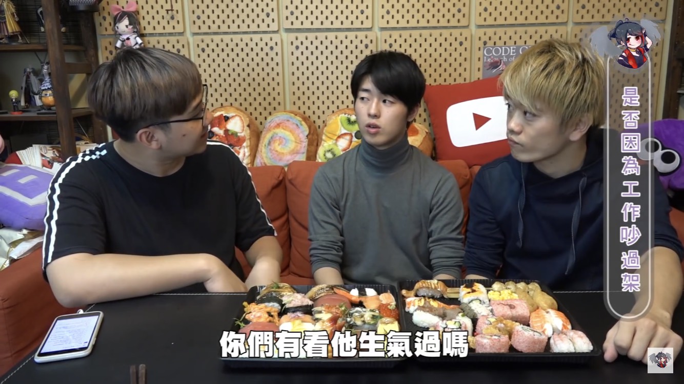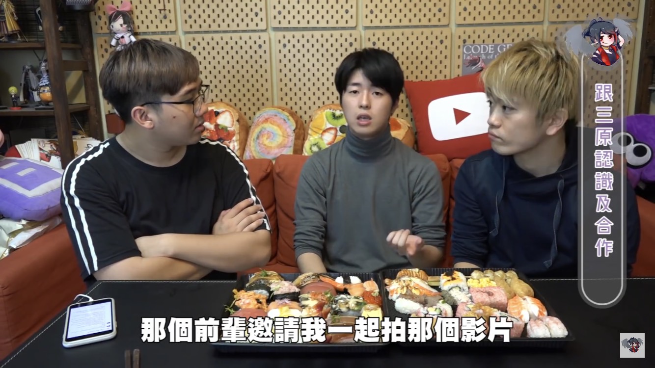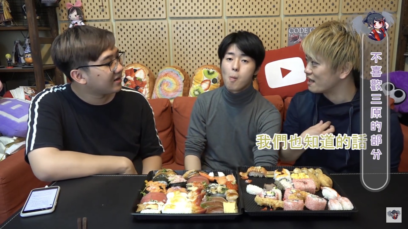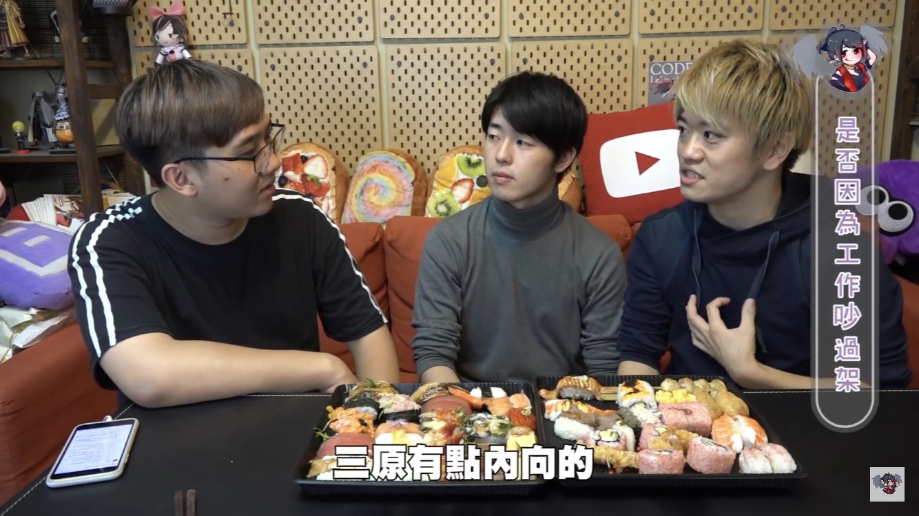 黑羽的這餐我請,這次請到三原團隊中的Jun醬、Tommy,除了邊享受壽司大餐,不免俗也得接受黑羽的問題,當黑羽問到團隊中有沒有因為工作吵過架時,兩人均表示,團隊從來沒有吵過架。至於為什麼會跟三原認識後來加入團隊,Jun醬表示他跟三原同是慶應大學學長、學弟的關係,因緣際會下,就加入了,Tommy則是因為當時受朋友邀請,跟三原合作拍攝兩千元企劃後,才確立自己想當youtuber的目標。