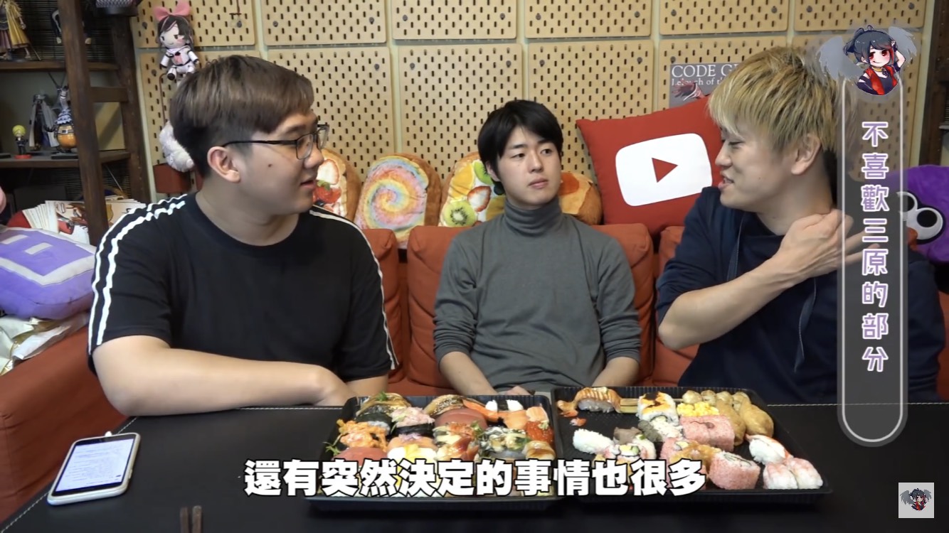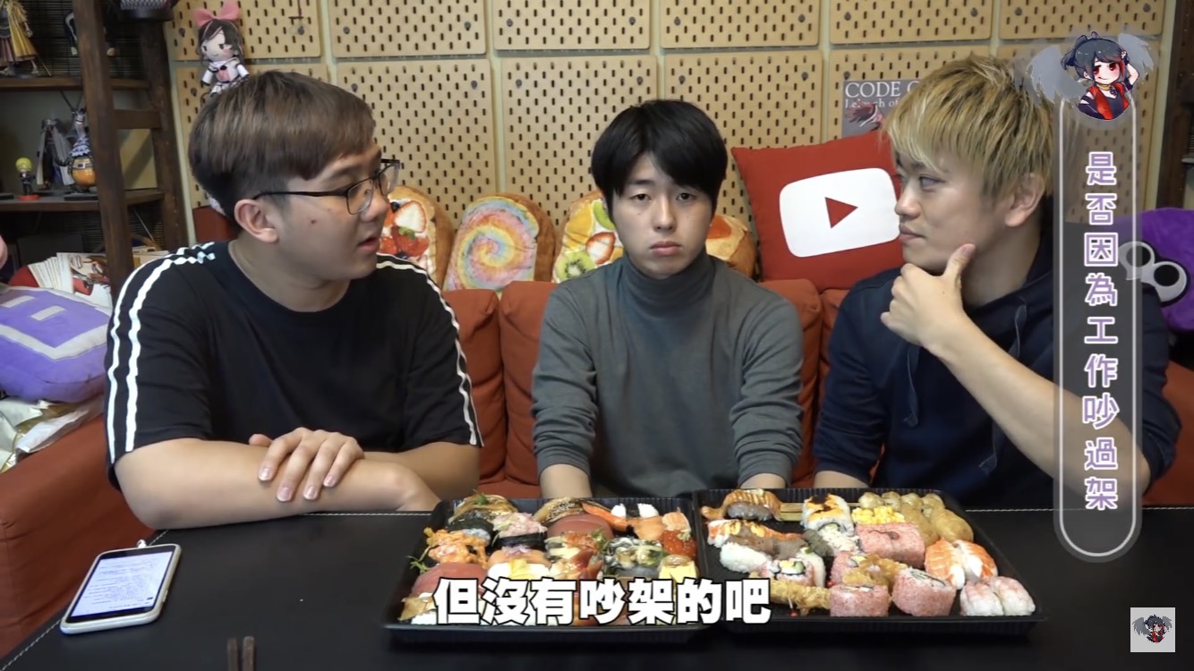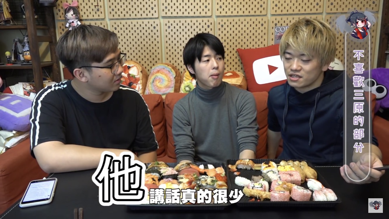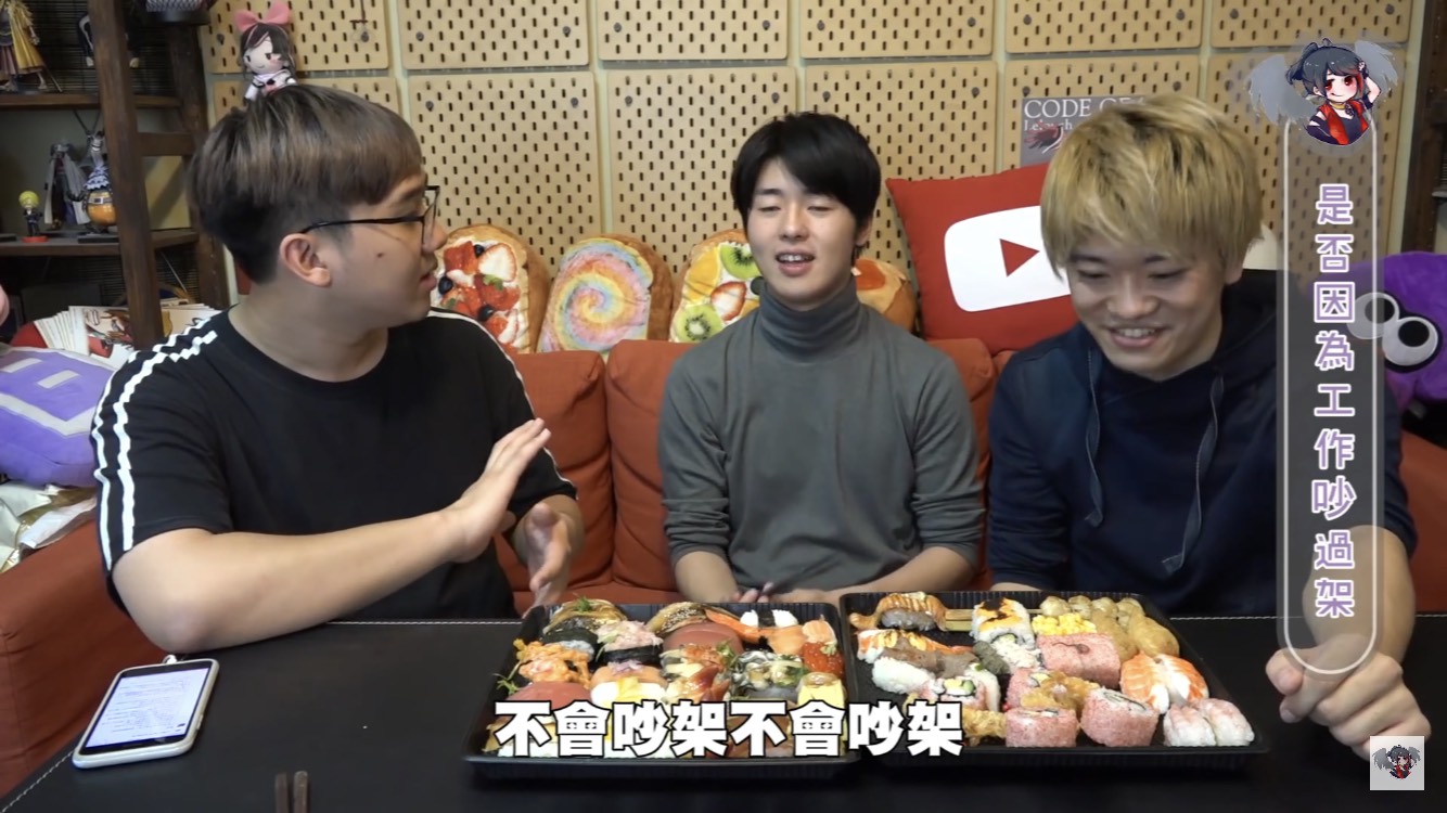 黑羽的這餐我請,這次請到三原團隊中的Jun醬、Tommy,除了邊享受壽司大餐,不免俗也得接受黑羽的問題,當黑羽問到團隊中有沒有因為工作吵過架時,兩人均表示,團隊從來沒有吵過架。至於為什麼會跟三原認識後來加入團隊,Jun醬表示他跟三原同是慶應大學學長、學弟的關係,因緣際會下,就加入了,Tommy則是因為當時受朋友邀請,跟三原合作拍攝兩千元企劃後,才確立自己想當youtuber的目標。