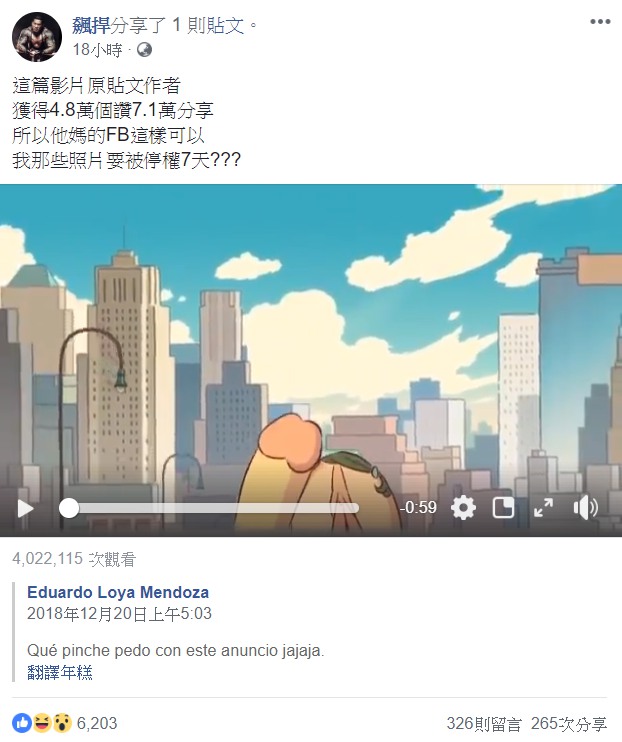 館長在今日PO出一則貼文,上面寫道:「這篇影片原貼文作者 獲得4.8萬個讚7.1萬分享 所以他媽的FB這樣可以 我那些照片要被停權7天???」,只見貼文轉發一則國外的影片,雖然是以動畫呈現,但影片內容非常大尺度,不過不但沒有遭網友檢舉,更沒有被臉書停權,也難怪館長會氣得發文。