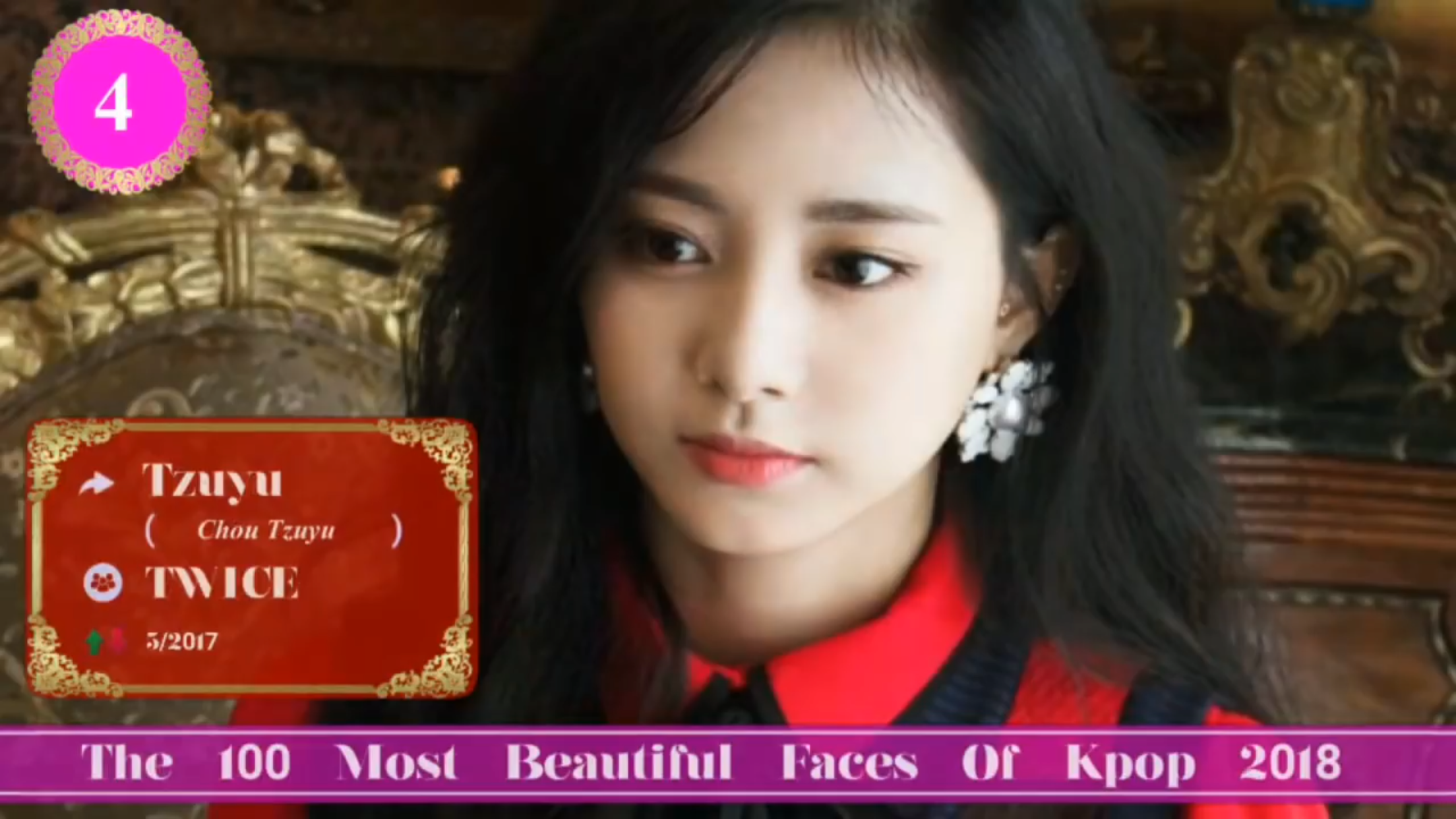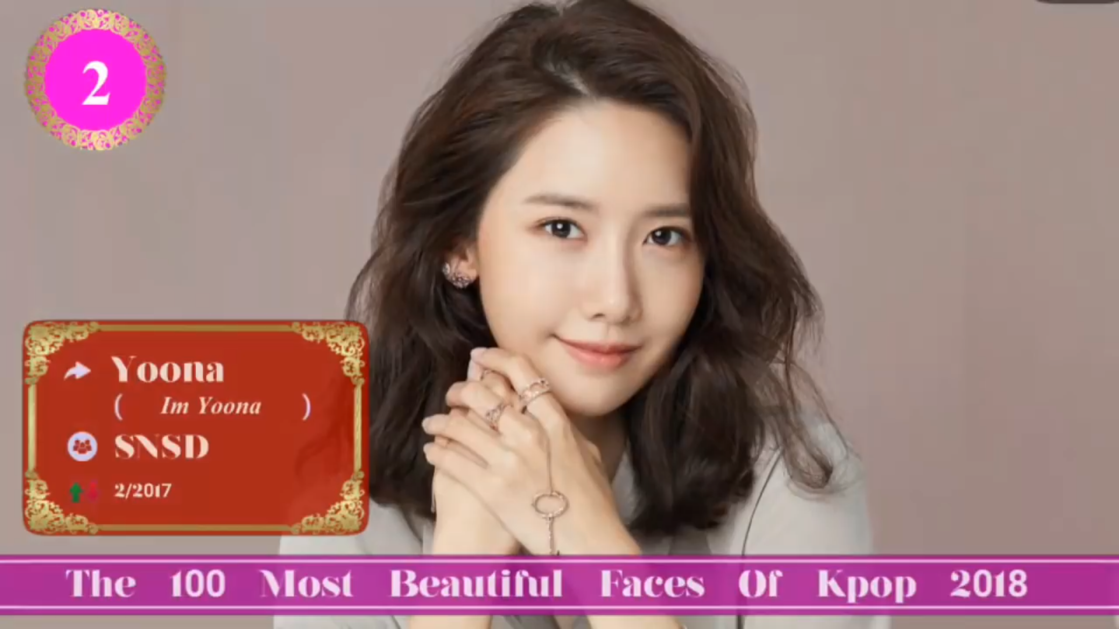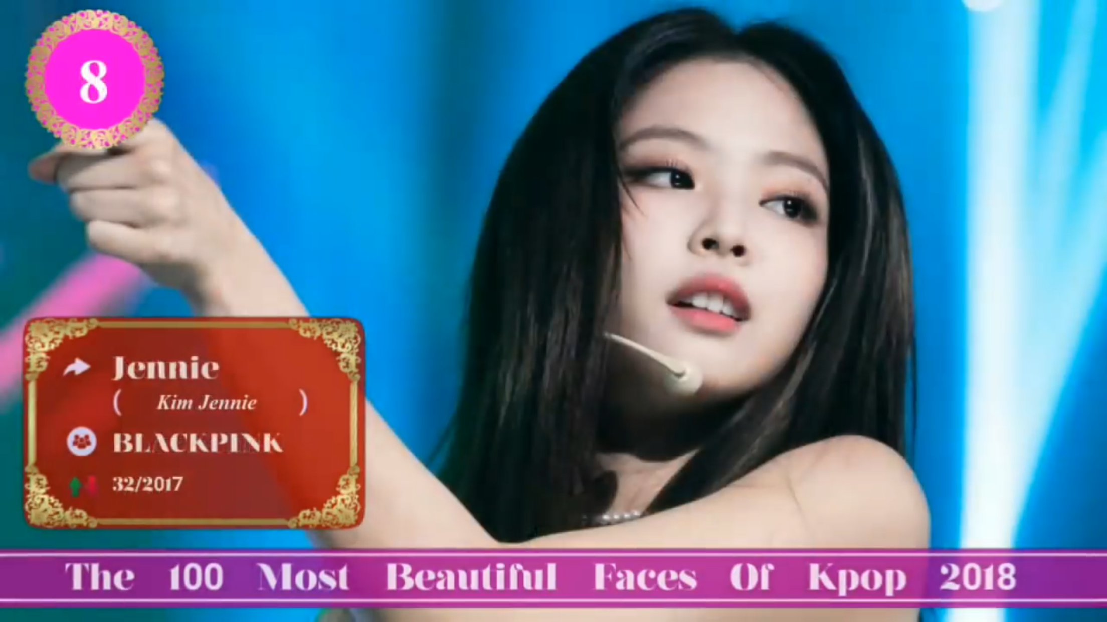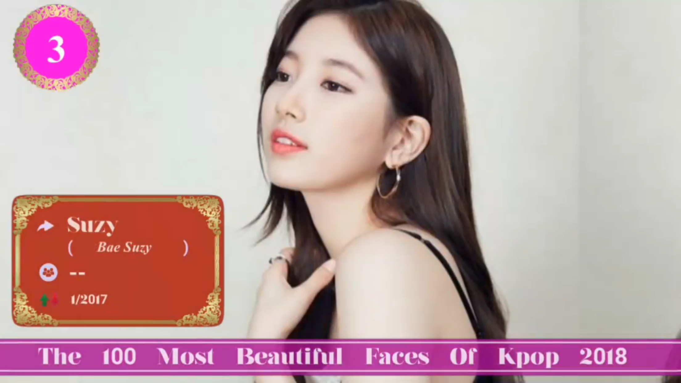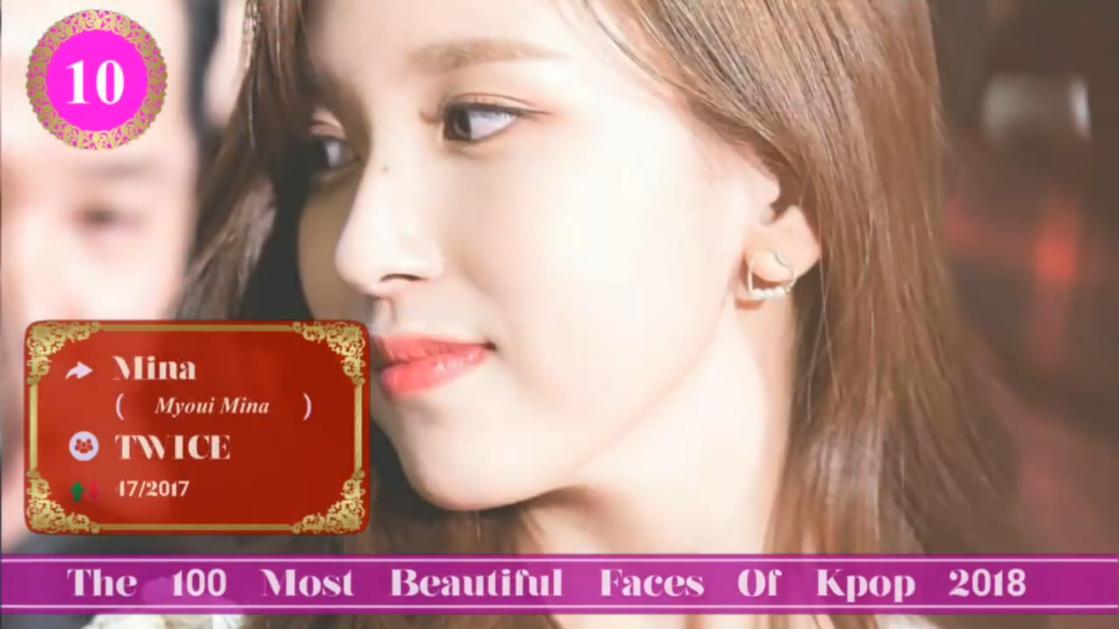這次的「the 100 most beautiful faces of kpop 2018」票選活動的第一名由 Red Velvet 隊長 Irene ,從去年的第 3 名上升到第 1 名可以說非常受歡迎!而第 2 名則由上榜多年、與去年排名持平的「少女時代」成員潤娥奪下,第 3 名則是去年的冠軍、有「國民初戀」封號的秀智得到,第 4 名為南韓人氣女團 TWICE 的台灣成員周子瑜,第5名是跟去年比足足上升了 7 名的 BLACKPINK 成員 Jisoo(金智秀)得到。