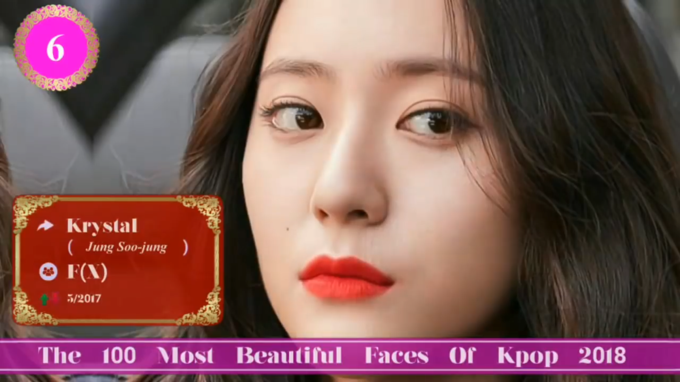 而第 6 名為女團 f(x) 成員 Krystal(鄭秀晶),雖然跟去年比掉了一名但依然還是相當受歡迎,而接下來依序的排名為:少女時代隊長太妍、和出道兩年就 solo、與 EXO 成員 KAI 爆發戀情的 BLACKPINK 成員 Jennie,以及 After School 成員 NaNa,第10名則為 TWICE 的日籍成員 Mina。前十名可說是各有各的特色,宛如仙女下凡呢!