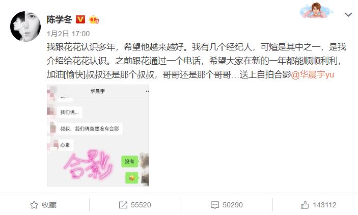 事實上,華晨宇的新的經紀人是透過曾出演過電影《小時代》的演員陳學東介紹,華晨宇成立工作室隔天(2日),陳學東在微博公開和華晨宇的對話紀錄,證實新的經紀人是他介紹的。文中,陳學東透露和華晨宇是多年好友,因為「希望他越來越好」,所以介紹經紀人給他,文末也祝福到「之前跟花通過一個電話,希望大家在新的一年都能順順利利」。