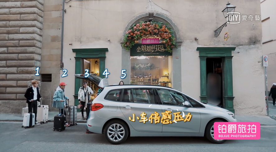 歐陽娜娜從波士頓飛往義大利佛羅倫斯與小S等人會合,從花店離開時,5人加上司機全要擠上這台小車實在有些勉強,但娜娜第一個反應就是指著放行李的後車箱說:「我覺得我可以坐著兒。」接著二話不說就鑽了進去,一個人默默跟行李坐在一起,連鏡頭都拍不到。