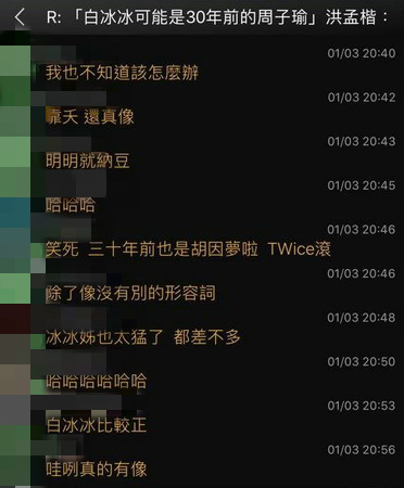 批踢踢鄉民翻出白冰冰40年前的舊照,其中一張白冰冰留著一頭烏黑秀髮,五官精緻,秀氣的跪坐在地上望向遠方,相當有氣質。網友將照片和周子瑜一比,還真的有幾分神似。照片一出留言立刻被刷爆,不少網友直說「真的有點像」,不過大部分的網友仍認為「根本一點都不像啊!」、「鬼扯吧!」、「差很多好嘛!」