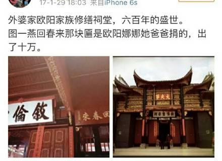 3日,歐陽娜娜和媽媽傅娟一同返回爸爸老家山西祭祖,當天母女兩人穿著一身素黑,臉上也沒有帶妝,照片中可見歐陽娜娜和媽媽虔誠的跪在神壇前,身旁圍繞著不少當地居民,根據網友透露,廟裡面的一塊印著「燕回春來」的匾額,就是爸爸歐陽龍多年前以人民幣10萬捐出的匾額,看的出來家庭對祭組的重視。