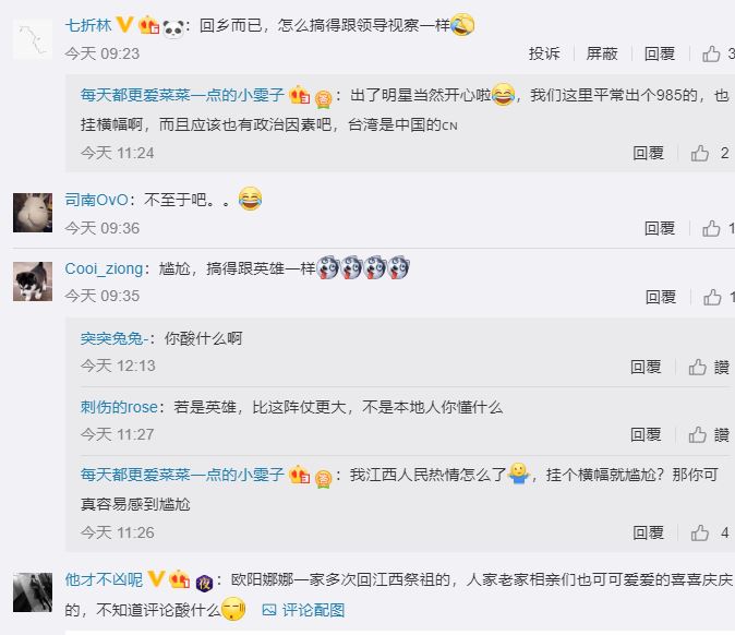而回鄉的歐陽娜娜也一展親民作風,不管面對大人或小孩都親切合照,絲毫沒有架子,照片一出,不少粉絲都相當驚訝歐陽娜娜的祖籍並說到「原來是江西美人啊」、「原來歐陽發源地在江西」,當然也有部分網友認為陣仗誇張並評論到「回鄉而已怎麼搞的跟領導視察一樣」、「尷尬,搞得跟英雄一樣」,不過隨即也有山西網友反擊「江西人本就熱情」,認為沒有哄抬歐陽家族的意思。