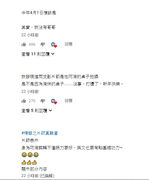 影片發出後還有網友在影片底下搞笑回應「今年四月一號應該是 其實我沒有哥哥!」還有眼尖網友表示「我發現這兩支影片都是在阿滴的桌子拍攝 是不是因為滴妹的桌子........沒事,打擾了,新年快樂。」還有網友替剪片師說話「片師表示