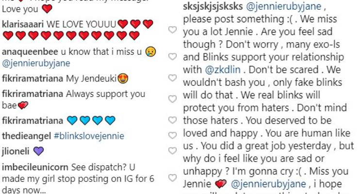 緋聞傳開後6日終於發文,Jennie卻慘遭部分網友批判缺乏藝人專業,並指出「從沒看過那麼自私的人,在舞台划水也談了戀愛,完全不顧其他成員」,對此,其他粉絲再看到Jennie金唱片獎上落淚,紛紛湧入Instagram上留言表示「請不要再評論JenKai了」、「你昨天的表演很棒,為什麼哭了呢」、「你值得被愛」。