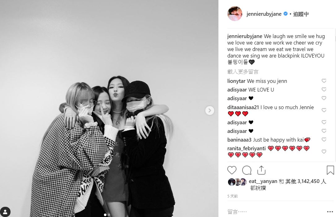 事實上,3日適逢成員Jisoo生日,Jennie和Jisoo在出道前就是多年好友,生日當天Jennie也未再認愛後首度更新Instagram,不料卻引起網友批判Jennie的行為影響團體發展。3日,Jennie分享了一張4人相擁微笑的照片,並配文回憶生活點滴其中也說到「我們一起哭、一起笑,我們相愛,也彼此照顧」,言語之間充滿愛意。