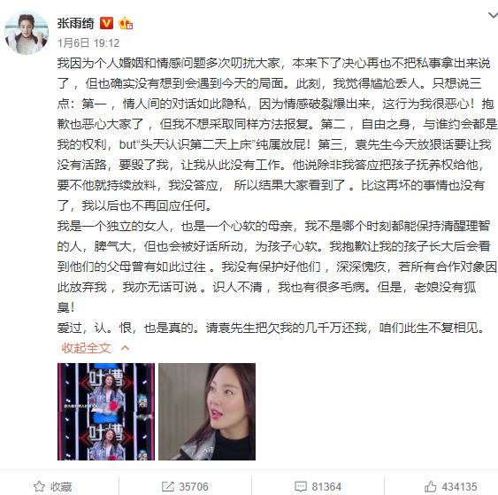 文末,張雨綺向事業合作夥伴以及她的孩子道歉,並說到「讓我的孩子長大後會看到他們的父母曾有如此過往 。我沒有保護好他們,深深愧疚。」也向演藝圈工作人員表示「若所有合作對象因此放棄我 ,我亦無話可說」,將過錯全都歸咎自己「識人不清」,最後甚至駁斥前夫發言並表示「老娘沒有狐臭!」也向前夫討千萬債款,希望兩人能盡快劃清界線。