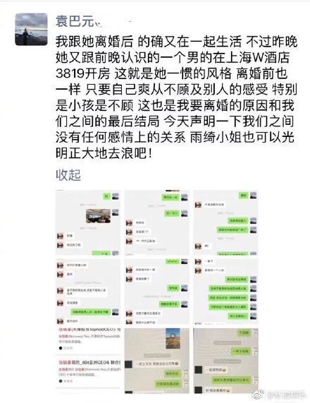 6日,張雨綺丈夫袁巴元透過朋友圈公開和張雨綺的對話,並指控張雨綺和認識僅兩天的男子在上海某飯店開房間,消息立刻在微博上流傳開來。文中,袁巴元甚至透露張雨綺的行徑「是她的一貫風格,離婚前也一樣,只要自己爽從不顧及別人的感受,特別是不顧小孩」,另一方面,也指出這是兩人婚姻告中的主因,文末直言說到「我們之間沒有任何感情上的關係,雨綺小姐也可以光明正大地去浪吧」。