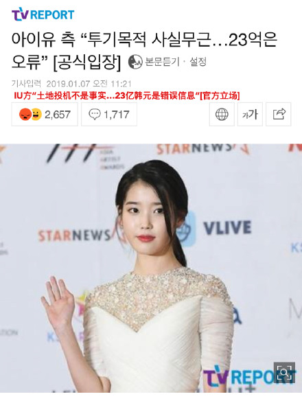 雖是投資有利,不過因為引起外界負評聲浪,對此IU所屬公司Kakao M也緊急出面澄清買房目的,絕非外界所謂炒地皮,只是想要離住家更近。聲明中首先表明「購買不動產和土地根本不是投機」,並解釋房屋用途「現在是IU母親的辦公室、IU的個人工作室以及IU支援的後輩們的工作室」,接著表明沒有出售計畫,所以不會賺到23億元價差,更何況「23億圓不是準確資訊, 且相關地區也並非開發地區」。