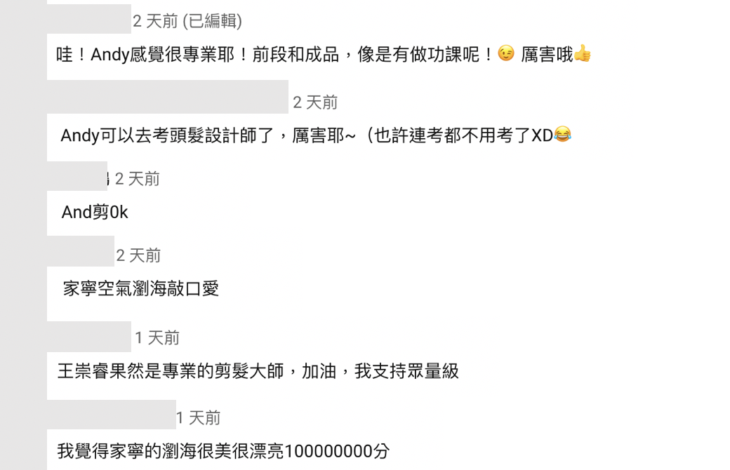 看見兩人如此有趣的互動,以及Andy操刀後的成果,網友也紛紛留言稱讚:「哇!Andy感覺很專業耶!前段和成品,像是有做功課呢!厲害哦」、「Andy可以去考頭髮設計師了,厲害耶~(也許連考都不用考了XD」、「Andy剪0k」、「家寧空氣瀏海敲口愛」、「王崇睿果然是專業的剪髮大師,加油,我支持眾量級」、「我覺得家寧的瀏海很美很漂亮100000000分」,網友們都非常喜歡Andy幫家寧剪的空氣瀏海!