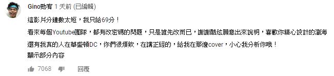 而事件當事人Gino則在酷炫的影片下方幽默回覆:「看來每個Youtube團隊,都有改密碼的問題,只是誰先改而已,謝謝酷炫願意出來說明」,不過他卻也笑罵反骨,「還有我真的人在華盛頓DC,你們很煩欸,在講正經的,給我在那邊cover,小心我分析你哦!」,留言還得到七千多讚,笑翻粉絲。