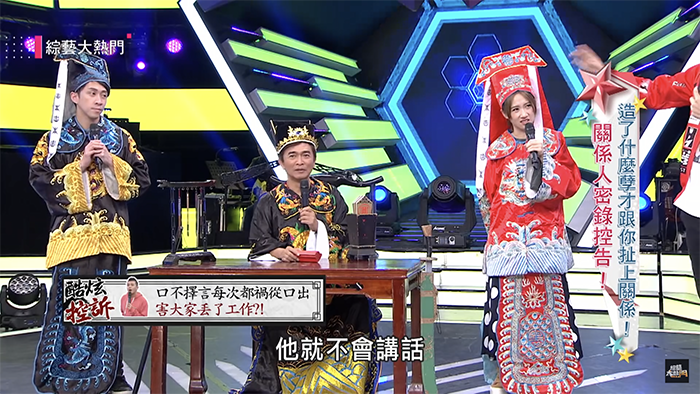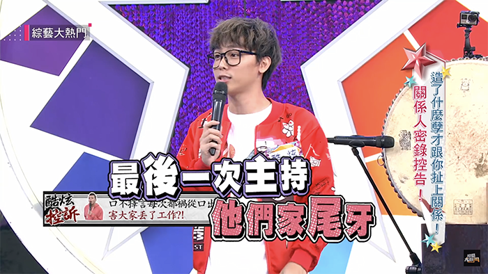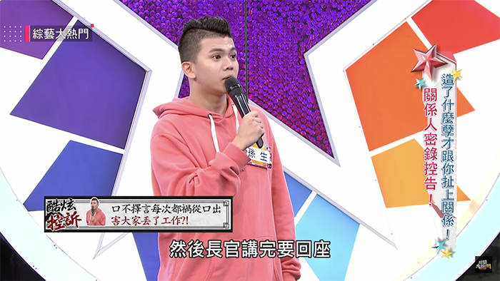 近日酷炫上節目《綜藝大熱門》要來控告孫生,他認為孫生「罪孽深重」,淨做一些讓人指指點點的事情,酷炫要控訴他「愛遲到」,甚至還把問題推到別人身上,像是孫生遲到時會怪罪酷炫沒有打電話叫他起床,讓酷炫傻眼表示:「請問遲到是你的事還是我的事?」,除了遲到的問題,酷炫還控訴他「口出狂言」,當時他們主持一家藥廠的尾牙,當長官致詞完畢要下台時,孫生便說:「請長官先行入土」,犯了長輩們很忌諱的大忌,酷炫也傻眼表示:「這是你最後一次主持他們家的尾牙了」,害反骨丟了工作。