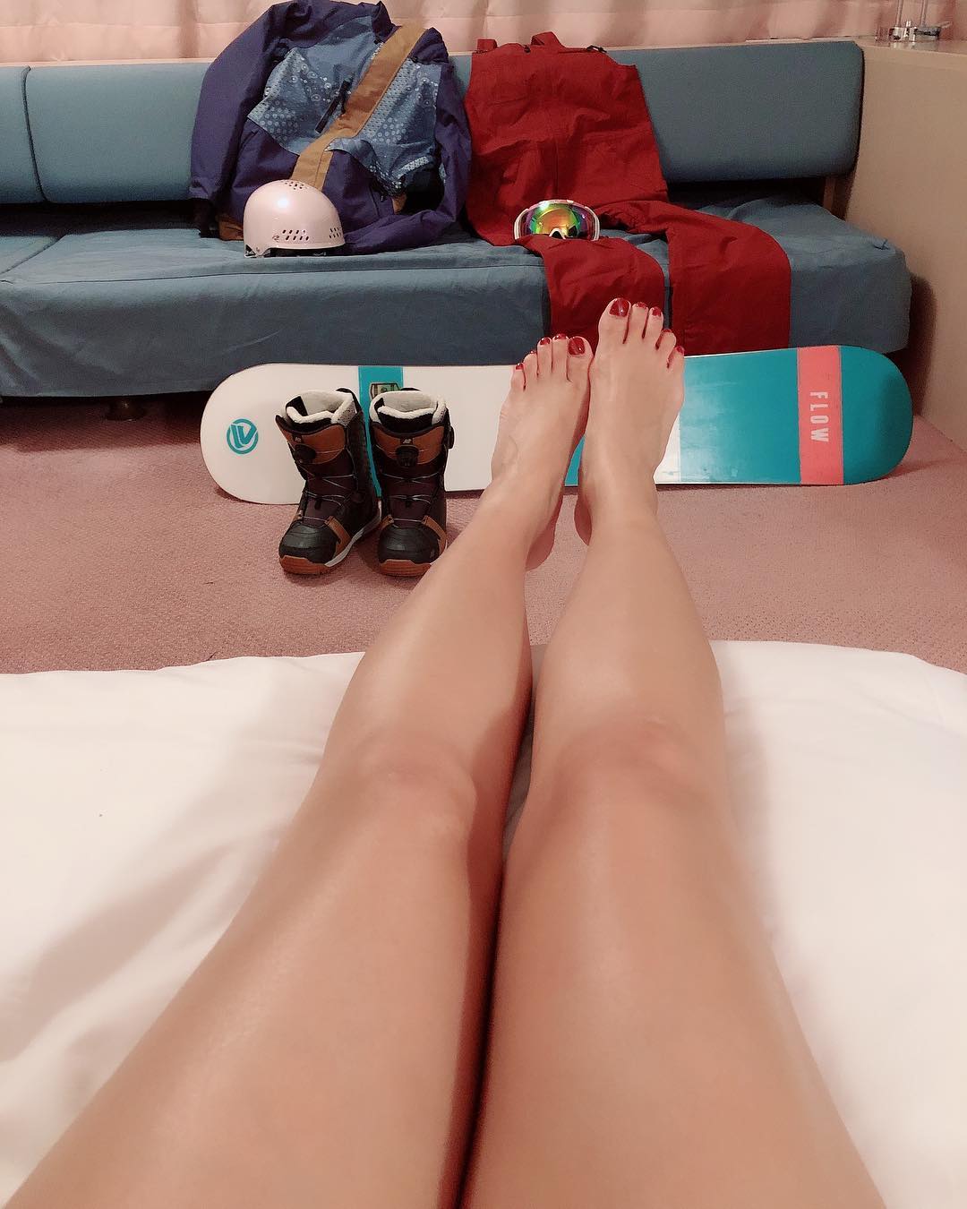 接著,她又曬出隔天要去滑雪的工具,沙發放著保暖衣物、安全帽、靴子及滑雪板,但網友們眼裡只有吳怡霈白皙纖細的大長腿,尤其腳上還擦著鮮紅色的指甲油,更添幾分性感。