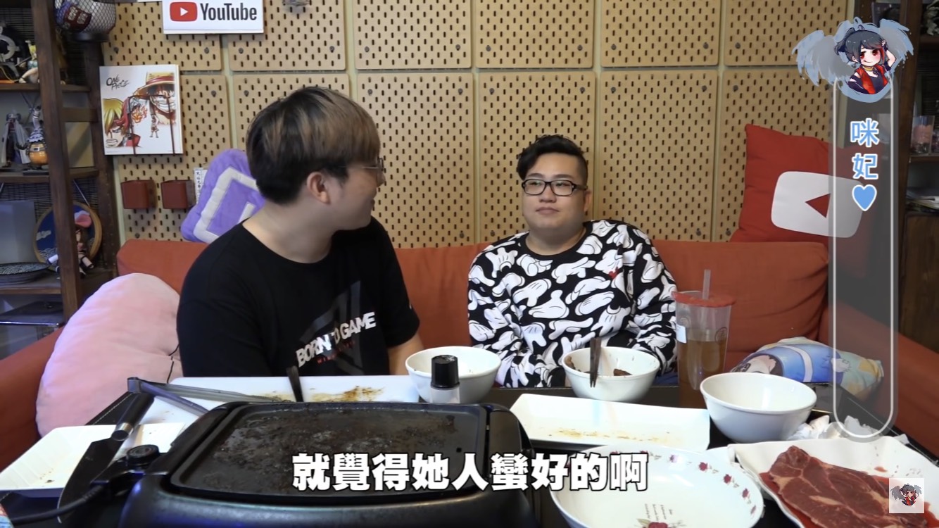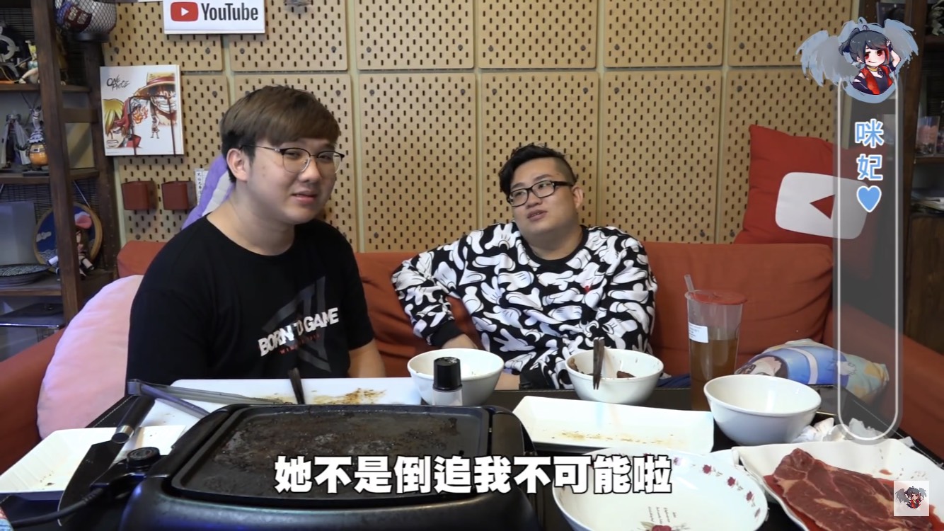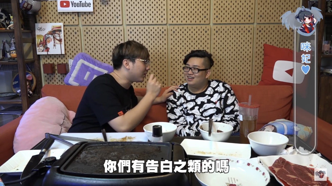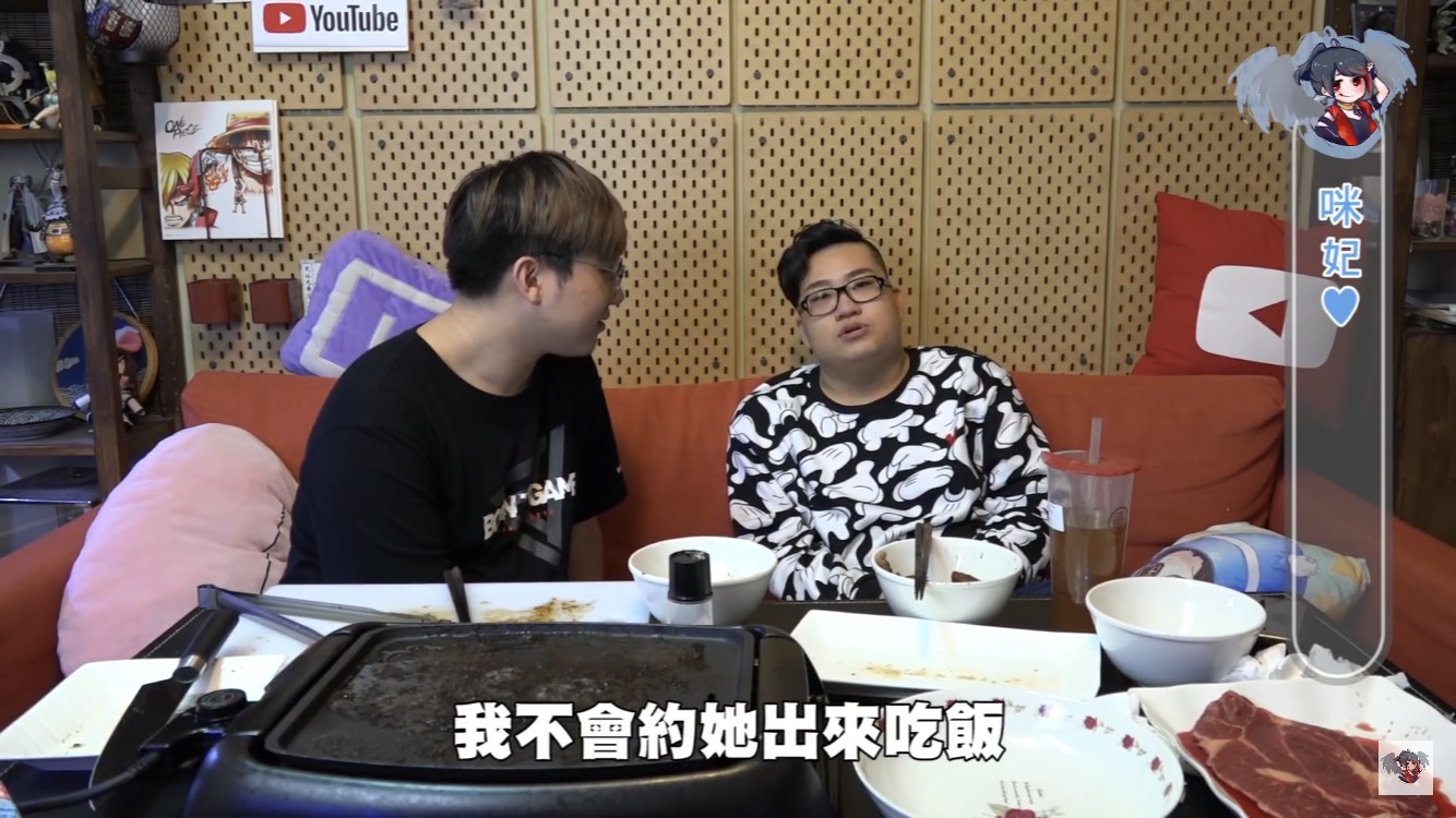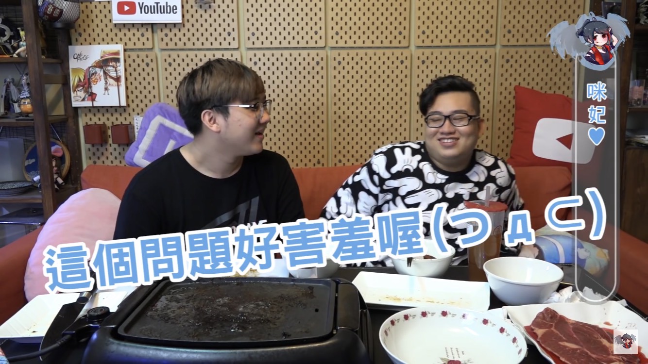 黑羽的這餐我請,少不了吃東西時還會搭配走心的問題,經過上面一連串問題,終於問到九妹「當初跟咪妃怎麼交往的?」,一問到這問題,九妹羞澀回答:「這個問題好害羞喔」,不過他也有補充說明:「覺得她蠻好的啊 會約她出來拍片」,但九妹也說明,當初並不會特別約她出來吃飯,但會約她拍片,畢竟他也坦言男生單獨約女生出去,就算是很明顯地追求。