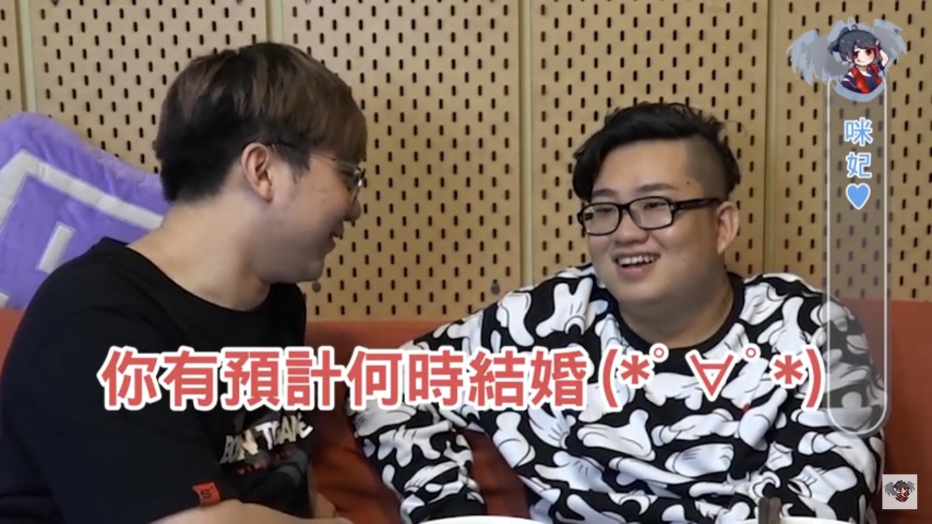 對此見縫插針的黑羽,反應超快就問說:「你有預計何時結婚?」,九妹大方承認:「我有預計」,不過後續在更深入的談話就被剪掉了,緊接著黑羽也問到兩人在一起多久,九妹也說他和咪妃:「在一起一年多了」,談到咪妃的個性時,他覺得咪妃是一個蠻認真的人。他也強調:「她沒有花到我什麼錢」,並表示咪妃自己也有收入,並不缺錢,對此黑羽也附和:「認真講咪妃真的不是因為錢跟Joeman交往」,最後久妹還搞笑說:「一定是因為臉」。