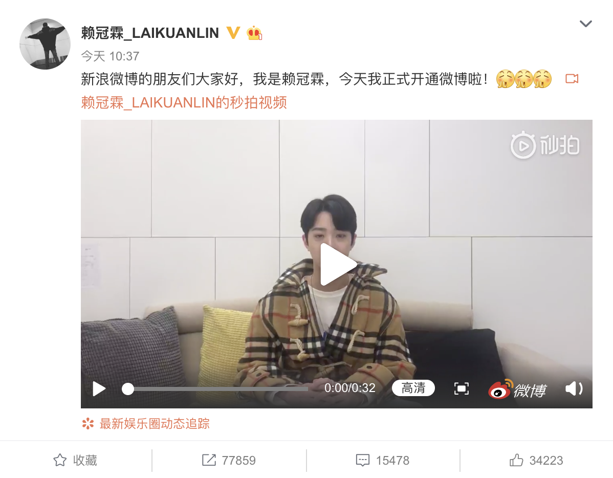 而今日賴冠霖在早上時開通了個人的微博,短短一小時之內追蹤人數就突破10萬人,在第一則貼文中賴冠霖也和粉絲們熱情的打招呼,他公開自己接下來幾天都會待在北京,還請粉絲們多多推薦北京的美食以及好玩的地方。有趣的是,他的微博目前只關注了三位,這三位都是微博上官方的帳號,也讓人期待究竟他會關注哪些人呢!