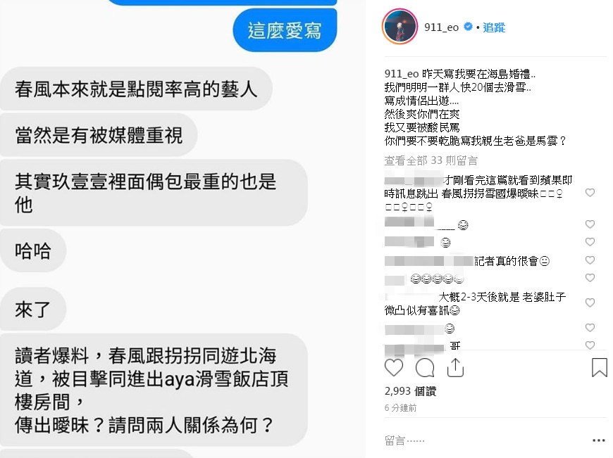接二連三的爆料,春風無奈在IG澄清:「明明一群人快20個去滑雪,寫成情侶出遊…,然後爽你們在爽,我又要被酸民罵,你們要不要乾脆寫我親生老爸是馬雲?」而報導中的緋聞對象拐拐也大方在貼文留下一串「哈哈哈哈哈哈哈」,春風也立刻回:「超幹對吧!」不難看出春風無奈的心情。