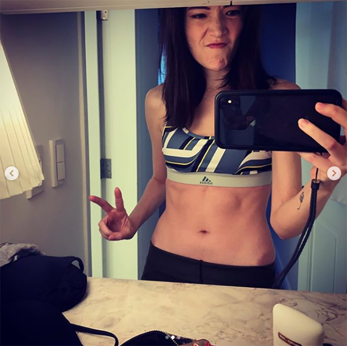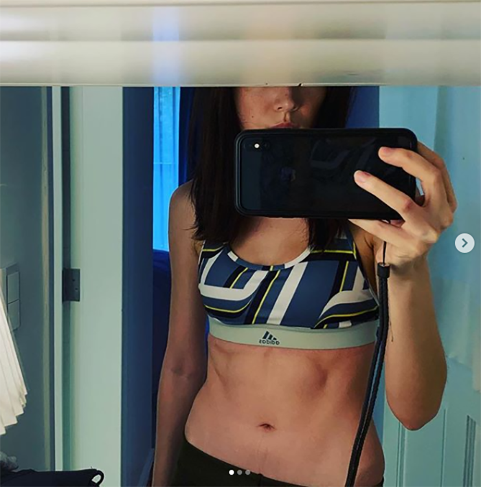 對此,她乾脆直接曬出肚皮的照片,大秀健身成效駁斥假爆料。從她PO出的照片可見,僅有40幾公斤的她,穿著運動內衣和長褲,露出白皙的肌膚,身上絲毫沒有多餘的贅肉,明顯的腹肌腺條看得出鍛鍊許久,而她也笑稱自己是「小筋肉人」,還幽默寫下:「老闆來一碗半筋半肉!」