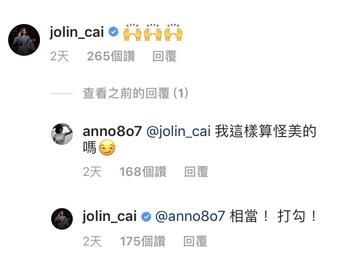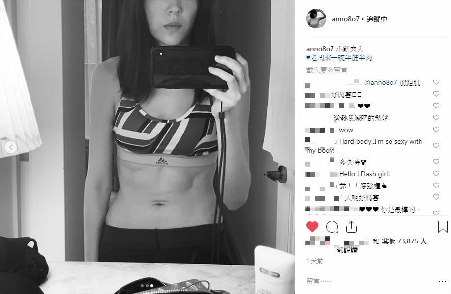 而她超精實的腹肌照曝光後,也吸引許多網友留言按讚,就連天后蔡依林也認證她是「小筋肉人」,讓她相當興奮,問對方「我這樣算怪美的嗎」,蔡依林則回應:「相當!打勾!」讓網友看了也直呼「這身材太不科學」、「我也好想要半筋半肉喔!」、「怎麼練的,求教學」