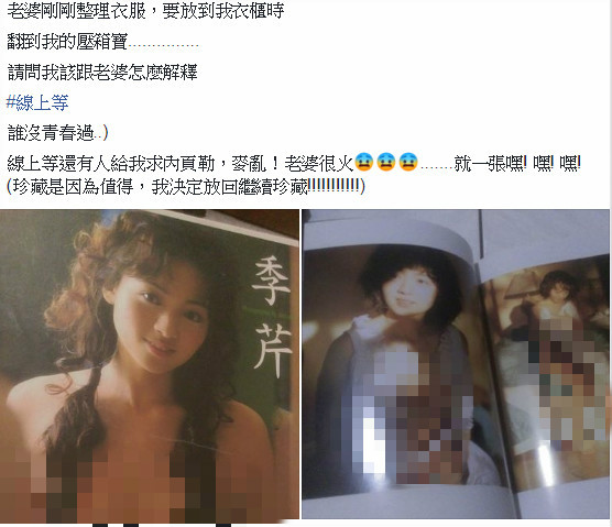 日前一名男網友在臉書「爆廢公社」PO文表示,老婆在整理衣櫃時,無意間翻出他珍藏多年的「季芹寫真」,且一翻開尺度超大,還有多張裸女圖,讓老婆看了超火大,他趕緊PO求助網友:「請問我該跟老婆怎麼解釋?」沒想到網友們看了笑翻大歪樓:「王仁甫比你老婆更火!」