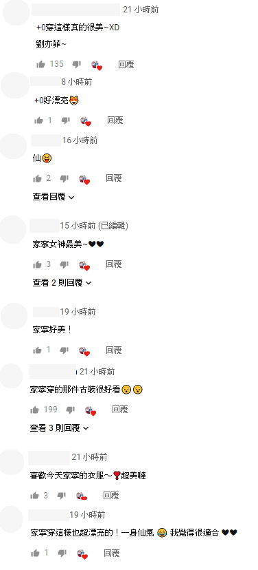 影片上傳之後,許多網友紛紛留言:「+0穿這樣真的很美~XD 劉亦菲~」、「+0好漂亮」、「家寕好可爱」、「家寧穿這樣很美喔」、「家寧真的很美耶」、「家寧好美啊!Andy超帥的啊!果然是男才女貌呢,我給你們的裝扮一百分」、「仙」。