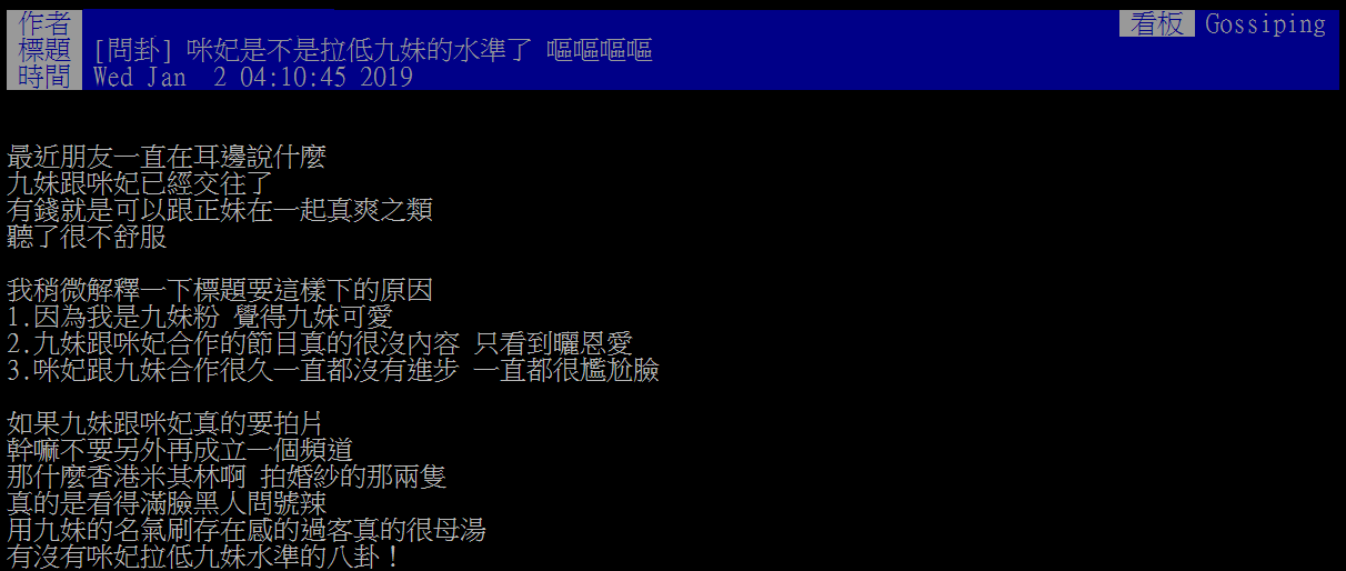 近日九妹上黑羽的企劃《這餐我請》,其中他提到,有許多酸民都覺得咪妃是為了錢才跟他在一起,對此他霸氣護航咪妃絕對不是為了錢,因為咪妃本身的收入就已經夠高!不過即便如此,這類的謠言仍沒有消停,有多數網友仍然狠酸「有錢真好」。近日就有九妹的粉絲在PTT發文「咪妃是不是拉低九妹的水準了」,提出咪妃和九妹的合作影片都在曬嗯愛,根本沒內容。文章一出,也讓其他網友留言:「咪妃叫正? 是有沒有這麼不挑 她素顏比素人還素」、「素顏普妹說自己正」。
