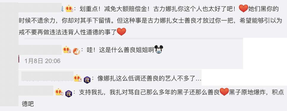 看見娜扎善良的替被告著想,大幅降低了賠償金,就有網友留言:「古力娜扎你這個人也太好了吧!她們黑你的時候不遺餘力,你卻對其手下留情。」、「像娜扎這麼低調還善良的藝人不多了」、「哇!這是什麼善良姐姐啊」、「支持我扎,我扎對罵自己那麼多年的黑子還那麼善良」