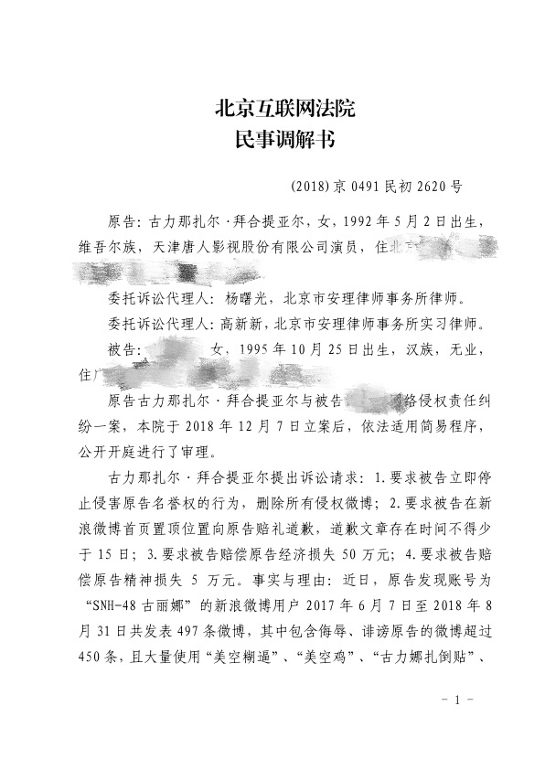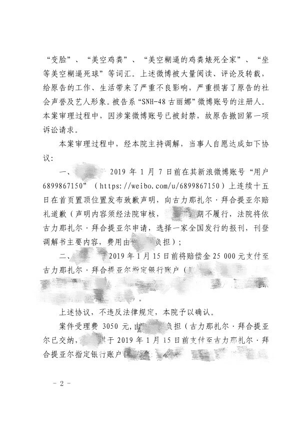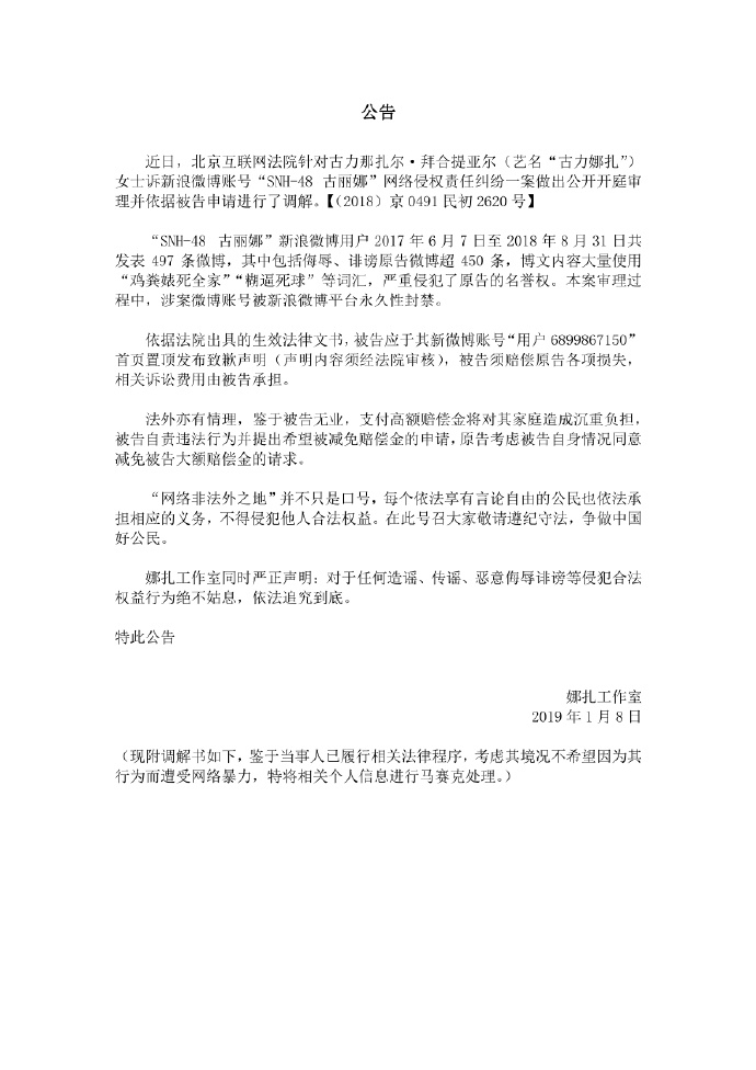 在8日時,古力娜扎工作室公開了法院判決書,內文提到除了被告須刊登道歉聲明之外,還需賠償古力娜扎50萬元,而被告也創建新的用戶「用户6899867150」,並刊登道歉文章,內文寫道:「由於我以為網絡是法外之地,隨便發洩、造謠也沒有關係 反正法不責眾也沒有人知道那個人是我 而且當時也抱有僥倖心理」、「在這裡鄭重的對你說一句對不起 娜扎 我錯了我不該在微博上咒罵你 」,然而原先要付55萬元的賠償金,但古力娜扎考慮到被告無業,同意對方想減免大額賠償金的請求,從原本的55萬減至2.5萬,被告也在貼文中感謝娜扎:「感謝你,減少了我的賠款,讓我不因我個人的過錯給家人增添負擔,謝謝」