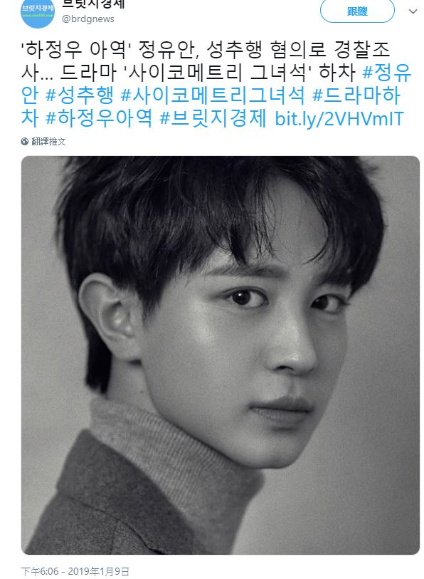 現年僅19歲的南韓演員鄭惟安(정유안)2015年以演員身分出道以來累積不少戲劇作品,其中以去年參演人氣電影《與神同行:最終審判》中何正宇的前世而受到關注。不料近期卻因涉嫌性騷擾接受警方調查,10日,所屬經紀公司VAST也出面證實此事,目前籌拍的新戲《會讀心術那小子》會否換角也仍在協商中。