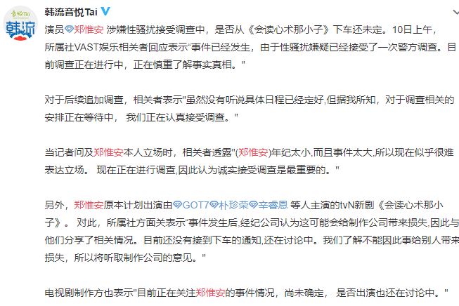 對此,10日,經紀公司VAST出面證實消息,並虛心表示「鄭惟安已經接受了警方的調查」會持續關注事態發展,韓媒也問及相關人士鄭惟安此刻的心情,他則透露「鄭惟安年紀太小,而且事件太大,所以現在似乎很難表達立場。」不過會積極配合調查。
