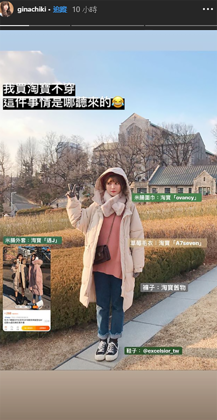 10日Gina在IG限時動態中打上:「我買淘寶不穿,這件事情事哪聽來的」,她也放上自己近日旅遊的照片,一一介紹自己的穿搭是來自哪些淘寶店家,證明自己是真的有在穿淘寶的戰利品。
