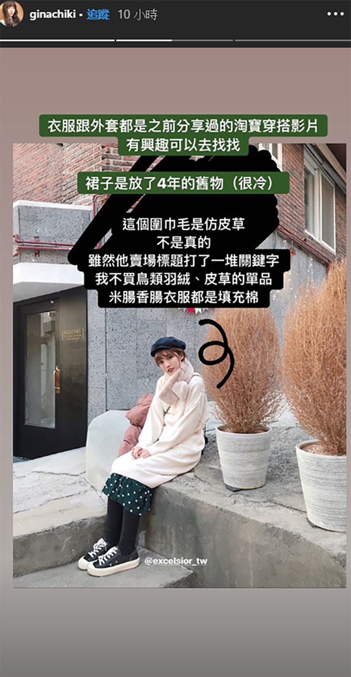 Gina也發了另外一張照片,解釋自己的圍巾並不是真的皮草,「我不買鳥類羽絨,皮草的單品,米腸香腸衣服都是填充棉」。