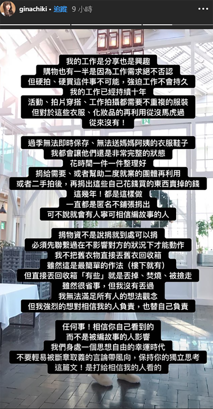 Gina說明自己將無法及時保存,以及無法送給媽媽阿姨的衣服鞋子都一一整理好捐出,或者是在二手拍賣後,將錢以匿名的方式捐出,「可不說就會有人寧可相信編故事的人」,表示還是會有人相信造謠者,只好親自澄清。