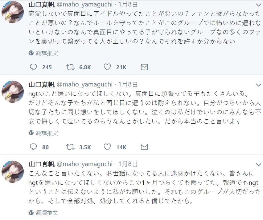 事發後,山口真帆出面報警,也求助NGT劇場負責人今村悅朗,負責人當時表示「會還給你一個乾淨的NGT,也會解雇壞人」,不過一個月下來,卻不見公司有任何舉措,甚至以山口真帆有「被害妄想症」試圖抹掉醜聞,更不讓媒體大肆宣揚,如今透過粉絲和山口真帆出面發聲,公司終於願意道歉並承諾盡快處理。