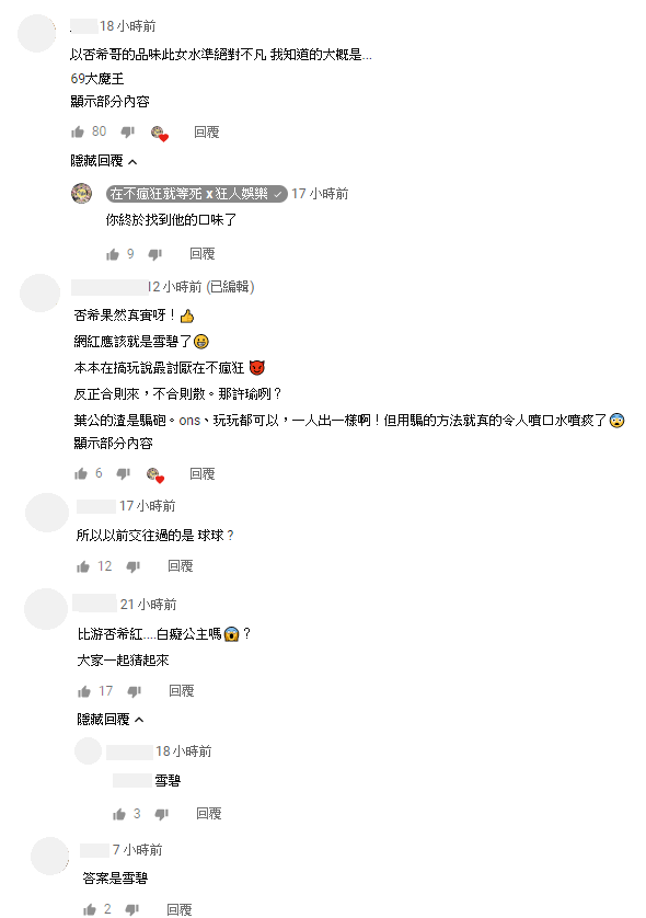 而影片發布後,關於否希前女友的猜測也層出不窮,雪碧、白癡公主、69大魔王、蕾菈、滴妹、魚乾等人都有被網友提出,「網紅應該就是雪碧了」、「以否希哥的品味此女水準絕對不凡 我知道的大概是69大魔王」、「所以以前交往過的是 球球 ?」、「比游否希紅....白癡公主嗎」、「比否希紅的女youtuber,百萬訂閱等級不就魚乾 滴妹 哈哈」、「答案是雪碧」。