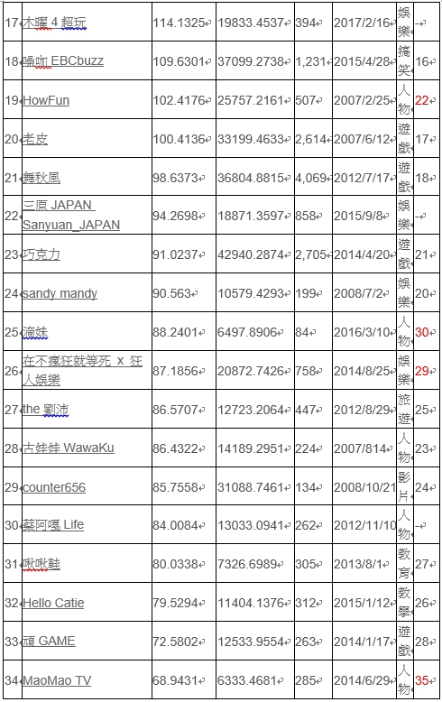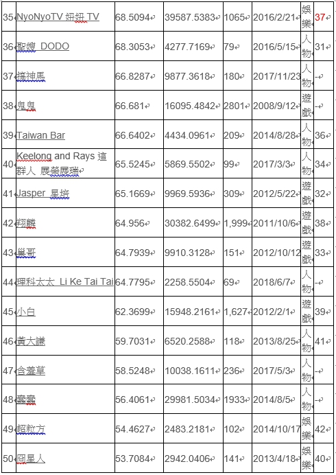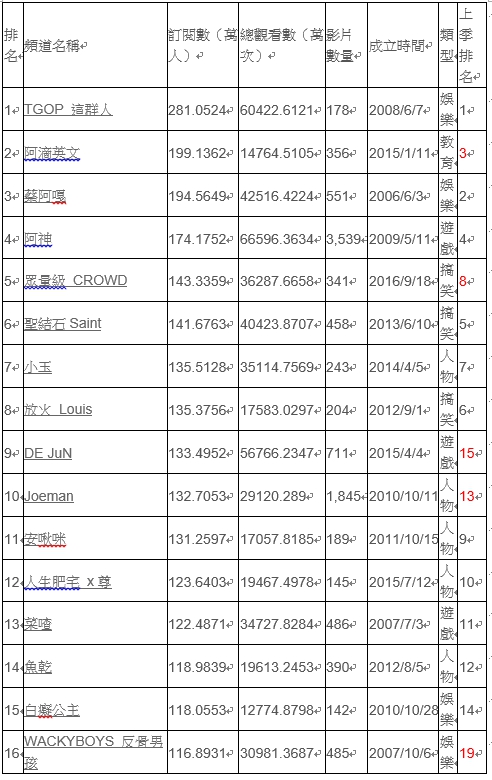 根據《SmartM》文章分析,Socialbakers.com依據當地粉絲人數,列出的台灣前250名YouTube頻道中,扣掉品牌、媒體、藝人等頻道後,選出網路原生的素人頻道,作為本次「台灣YouTuber Top 50名單」的排名依據。有不少的平台都會針對網路社群進行排名調查,方便觀察網路中的脈絡。而youtube便是網路聲量的最直接參考,台灣自媒體社群產業發展協會(簡稱「自媒體協會」),從2017年第四季起,每季針對台灣前50名YouTuber進行排名調查,本季最新排行又出爐啦~台灣許多youtuber排名再次洗牌,有人成功殺進榜單,當然有人落馬。