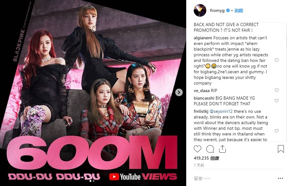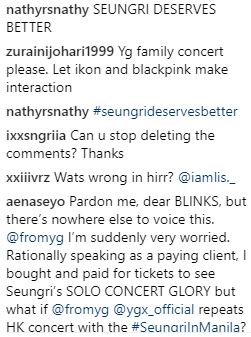 即便勝利首次以單人身分出席香港演唱會,獨挑大樑完成精彩演出,部分粉絲相當心疼甚至不滿,並到社長梁鉉錫的Instagram留言要求正視BIGBANG甚至2Ne1的社內資源,紛紛表示「勝利值得更好的資源」、「是BIGBANG讓YG有了今天,請不要忘記他們」,卻也有網友發現負面留言疑似被刪除並呼籲「為什麼要刪留言」,然而也有理性粉絲表示「勝利是用自己的方式替BP宣傳」,此外,實際上在BLACKPINK於泰國演唱會上,伴舞也是4位,並沒太多規格落差。